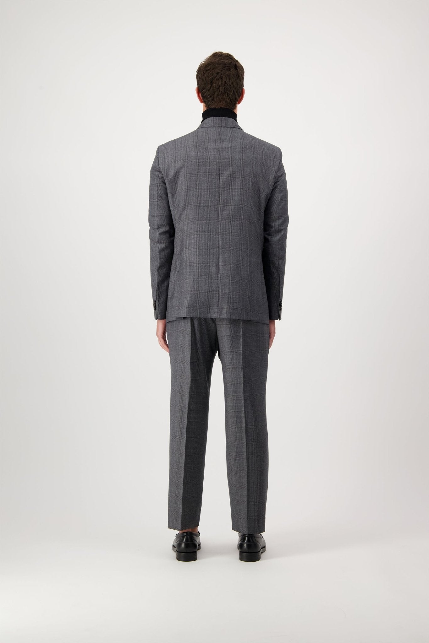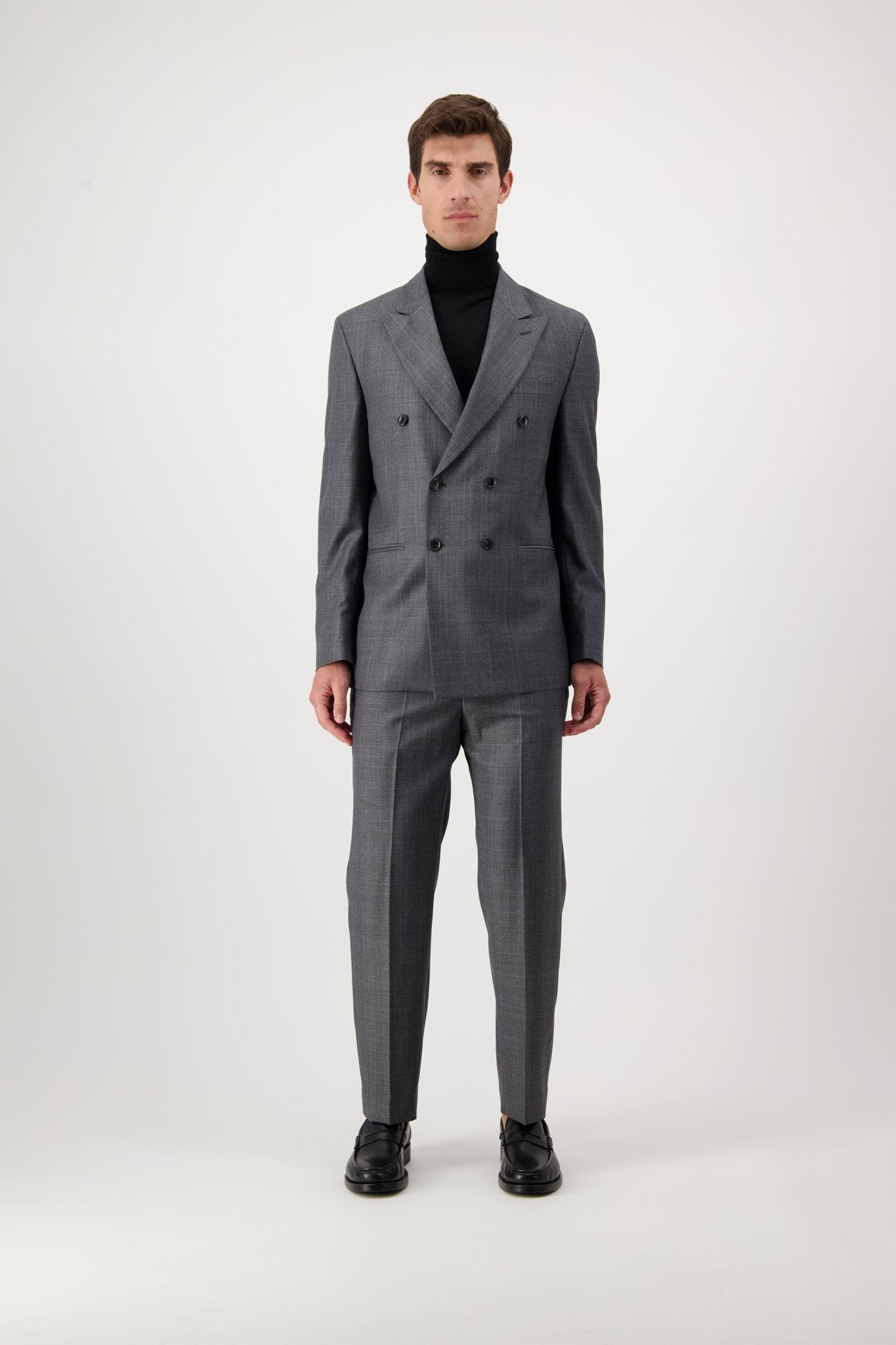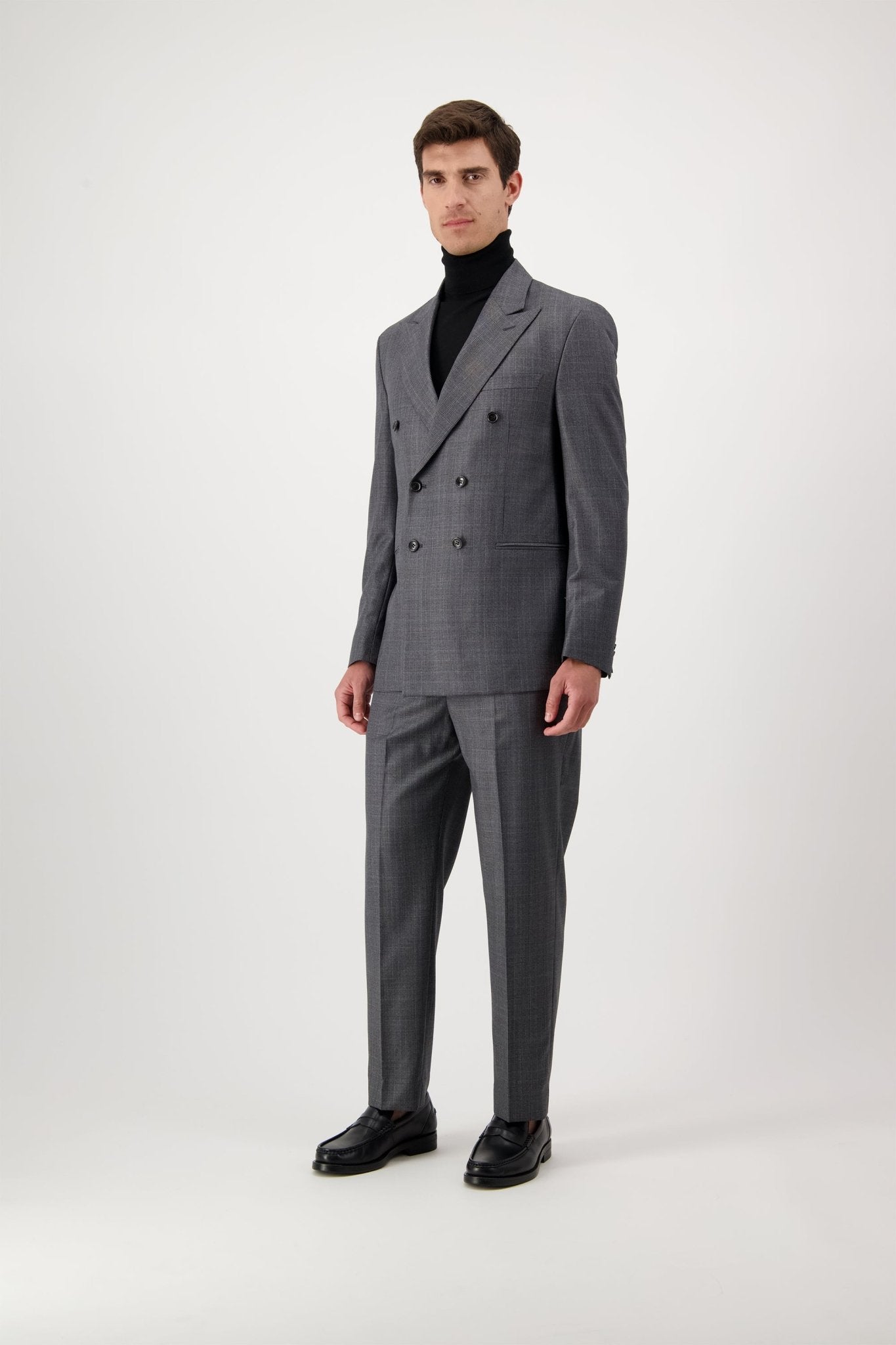 Double-breasted jacket with peak lapels, welt pockets and a breast pocket. Straight cuff with three buttons.