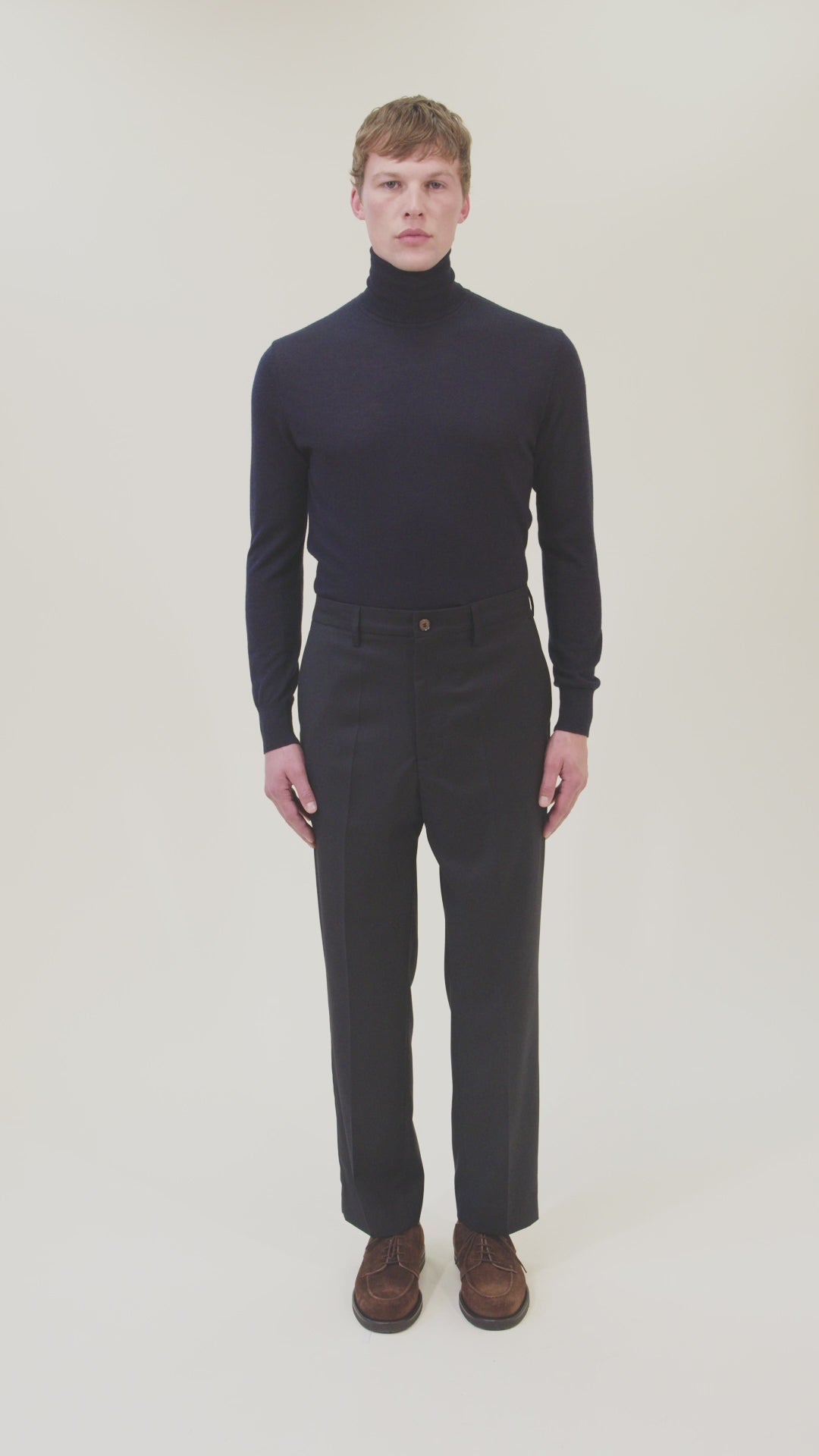 Elegantly cut mid-rise trousers with diagonal side pockets and refined welt pockets on the back.