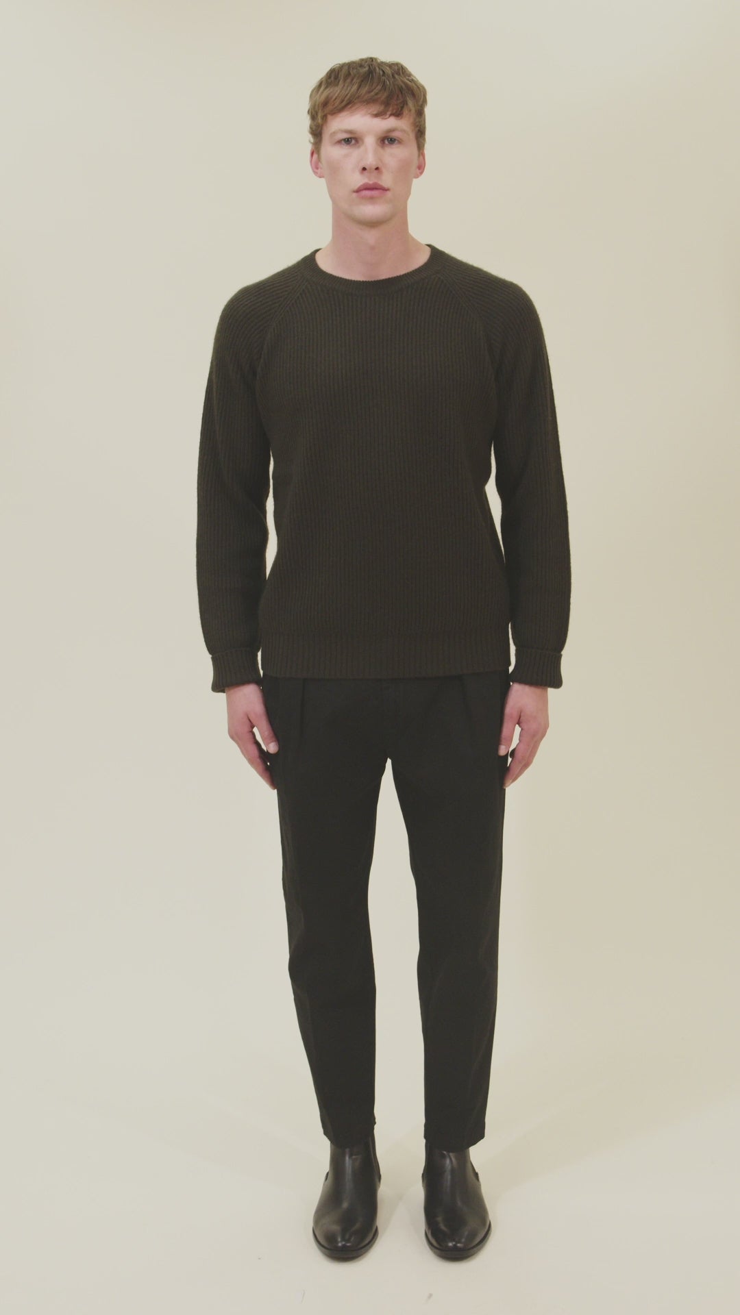 Crew neck sweater in English rib with raglan sleeves. Gauge 7 - 2 ply.
