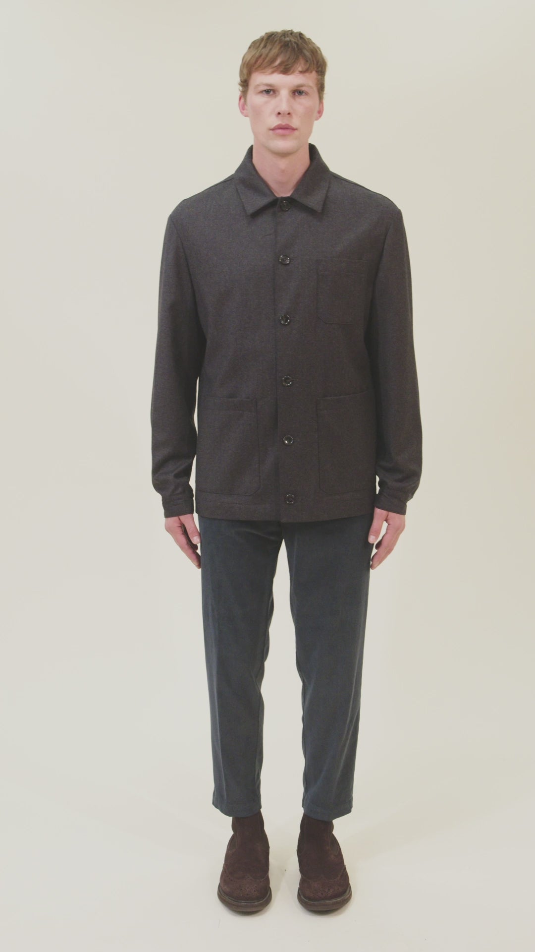 Elegant overshirt featuring a six-button closure, two side patch pockets, and a refined front pocket. This garment is shown on a 185 cm model wearing a size 50 with measurements: chest 95 cm, waist 82 cm, hips 92 cm.