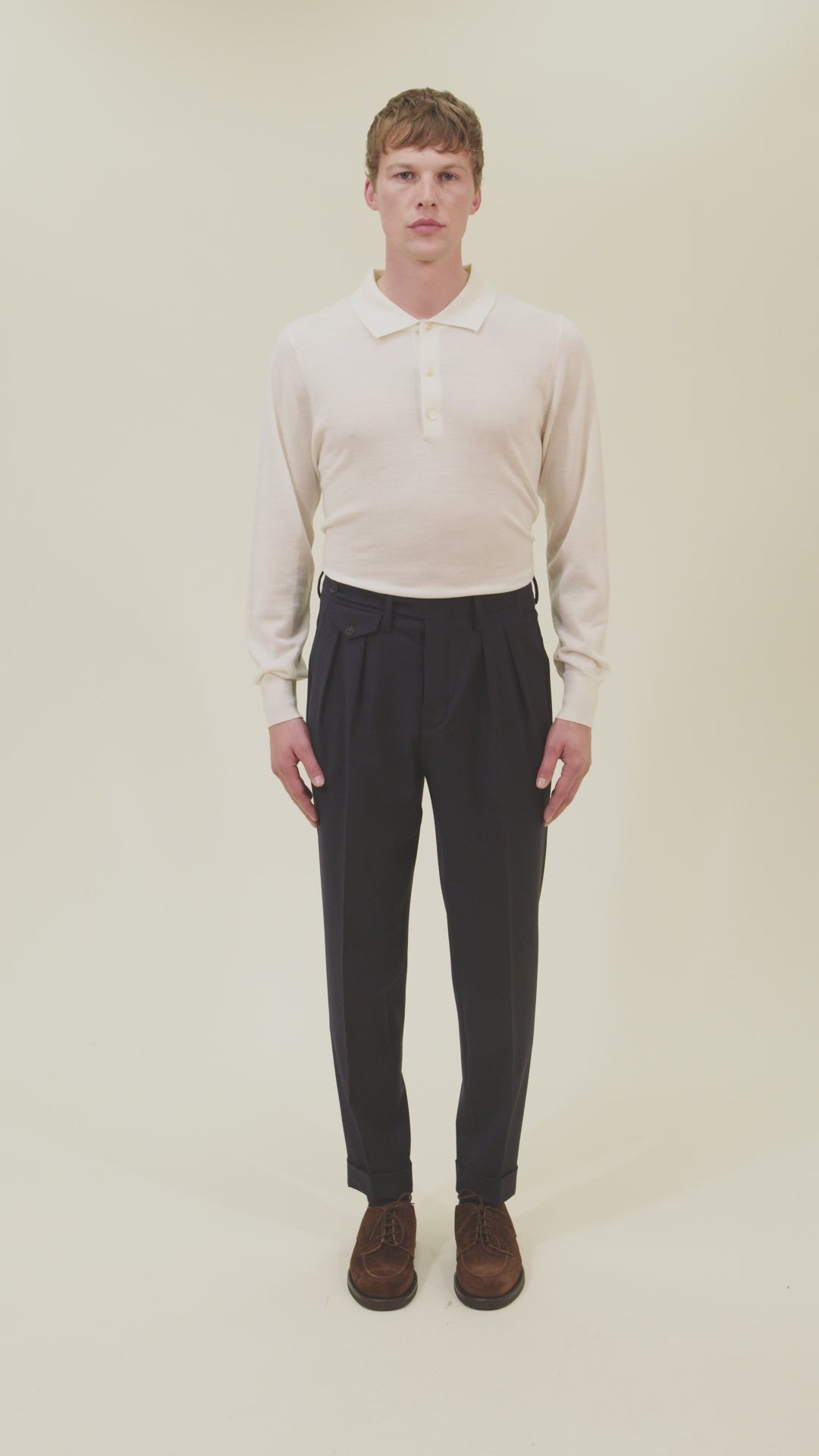 Elegant 16-gauge plain-knit polo shirt, embellished with three distinctive buttons. Crafted from premium Merino wool, it offers superior comfort. This garment is shown on a 185 cm model wearing size L, with measurements of 95 cm at the chest, 82 cm at the waist, and 92 cm at the hips.