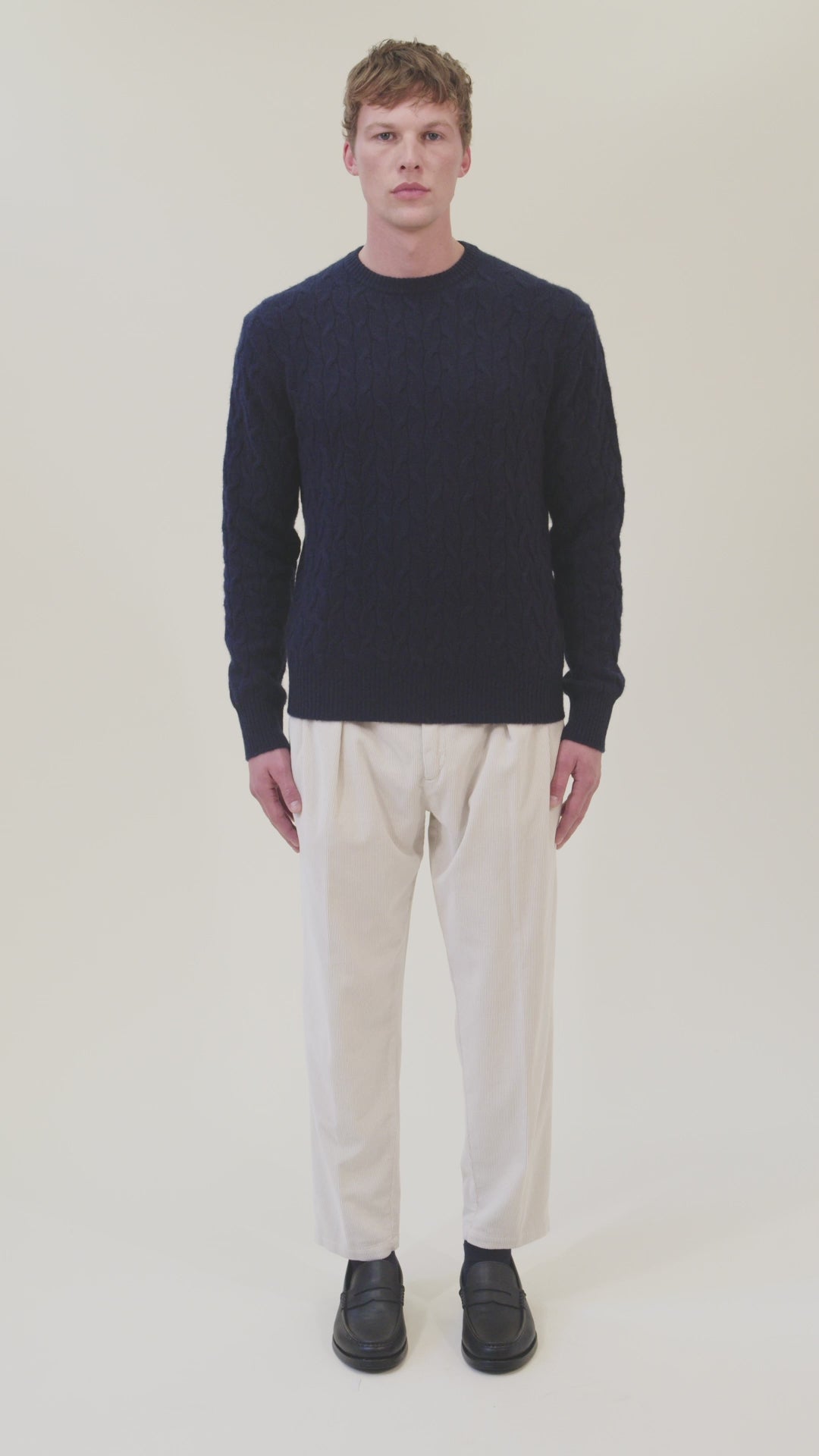 Crew neck sweater with cable knit. Gauge 7 - 2 ply.