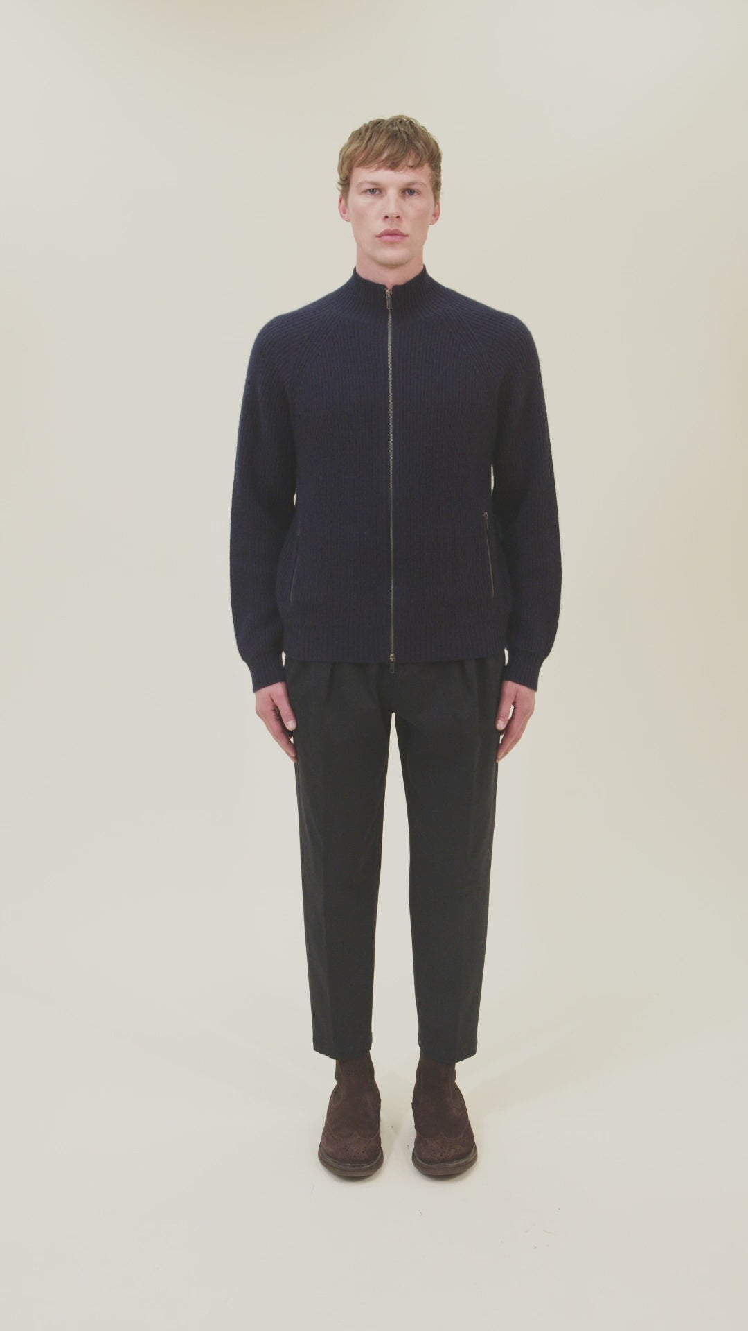 A luxurious zip-through cardigan featuring a refined English rib construction with elegant raglan sleeves and functional side pockets. Luxuriously knit from a 2-ply, 7-gauge wool and cashmere blend for exceptional drape and warmth.