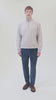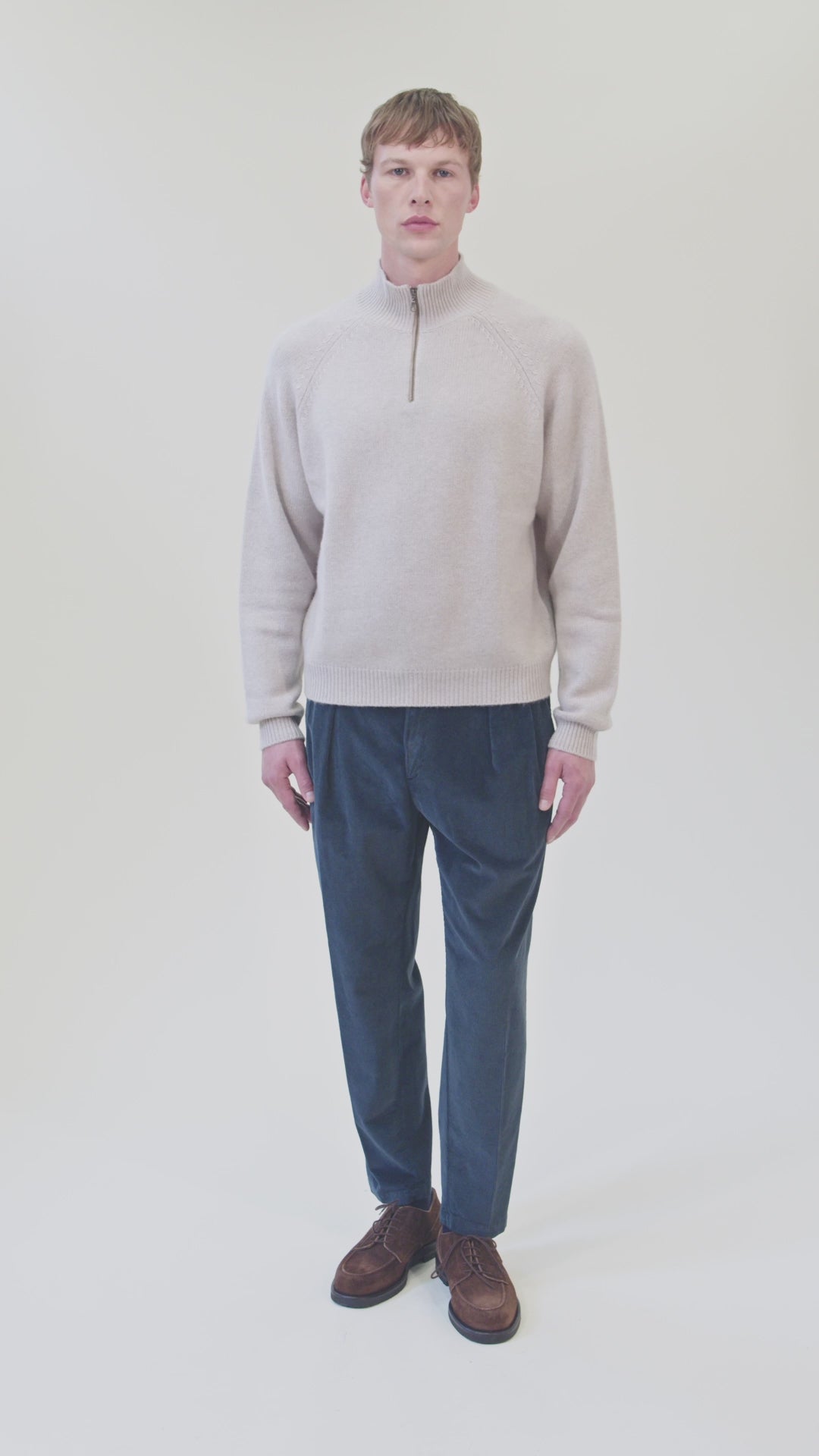 Elegantly crafted wool and cashmere blend raglan shoulder turtleneck sweater with center zip closure and smooth 3-ply 5-gauge knit.