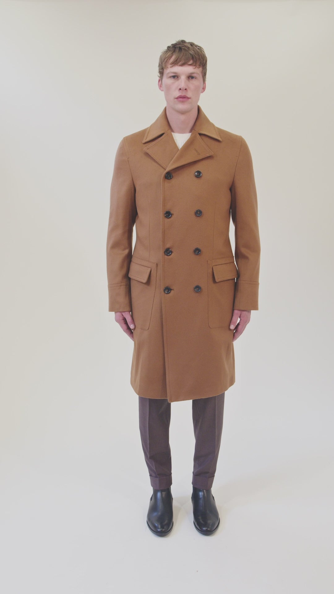 Elegant double-breasted coat crafted from premium virgin wool from Lanificio Colombo, featuring refined notched lapels. It features a sophisticated martingale belt on the back and patch pockets with flaps. The coat is worn by a 185 cm model wearing a size 50. His measurements are: chest 95 cm, waist 82 cm, and hips 92 cm.