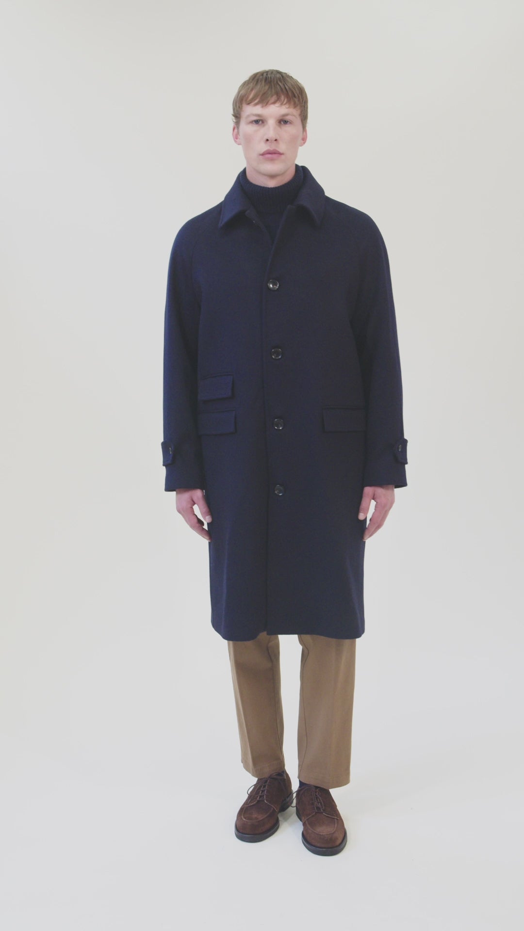 Long coat with raglan shoulders, crafted from pure virgin wool by Lanificio Colombo. It features a regular five-button closure and double flap pockets.