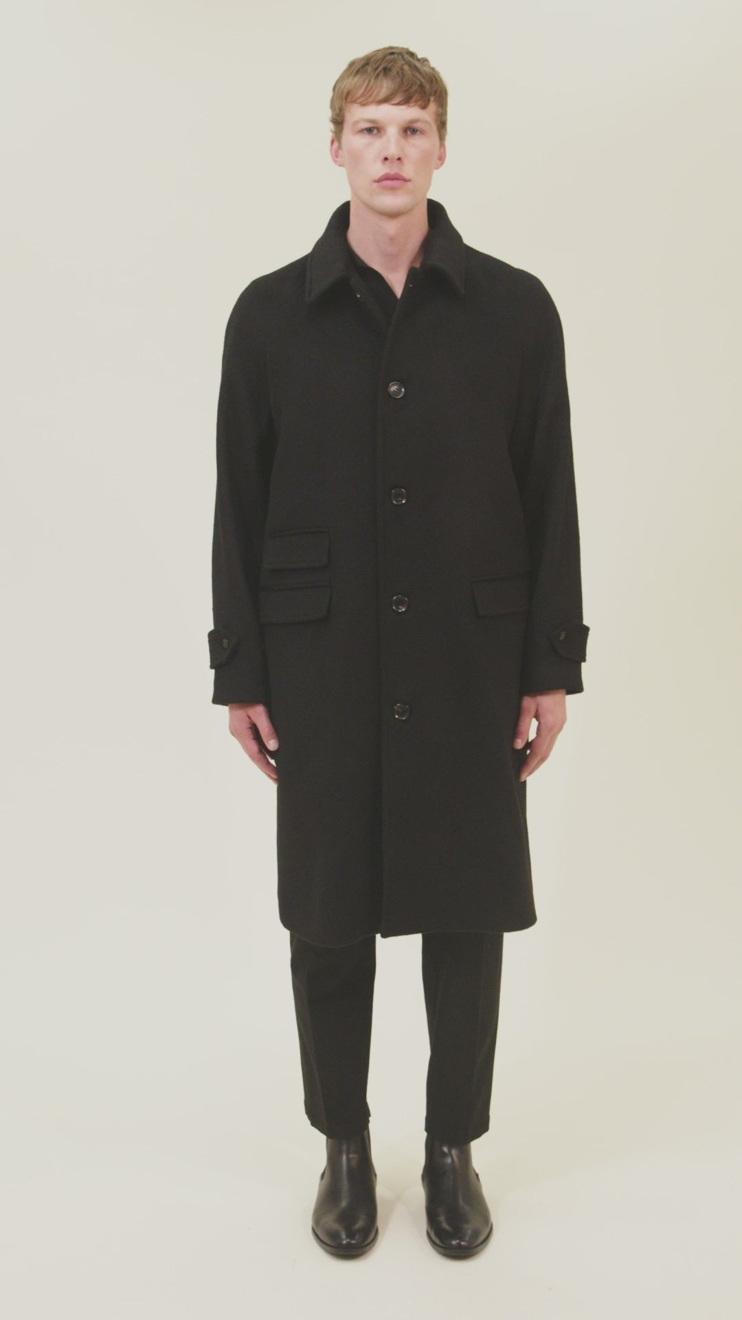 Exquisitely crafted from pure Colombo Mill camel hair, this long Windsor coat features an elegant raglan shoulder design. The refined silhouette features a classic five-button closure complemented by sophisticated double-flap pockets.