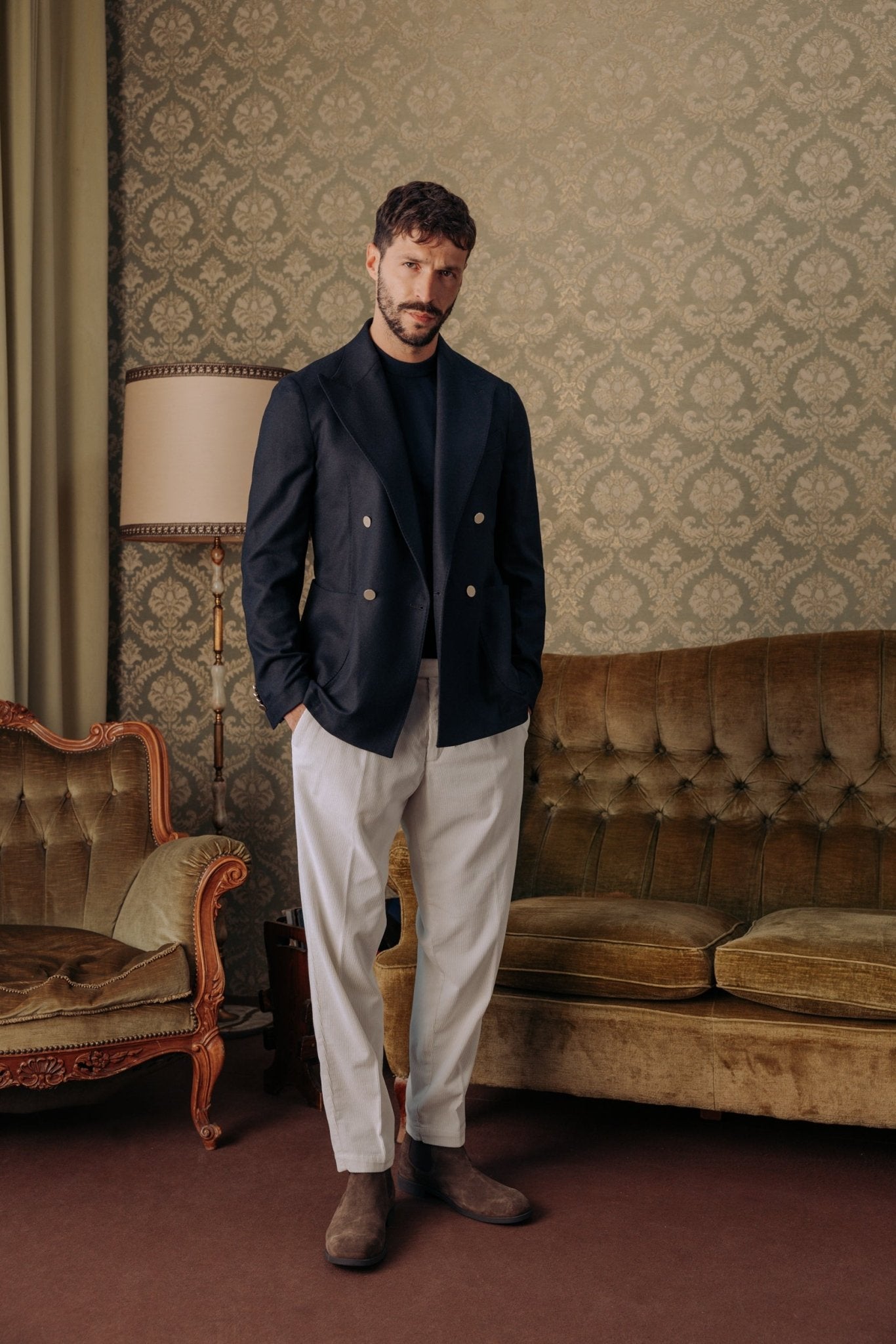 Elegante giacca doppiopetto realizzata in un pregiato tessuto. Il modello presenta raffinati revers a lancia, una chiusura frontale a sei bottoni in metallo lucido e pratiche tasche applicate che aggiungono un tocco di contemporaneità alla sua linea classica. Il taschino sul petto completa il design con un dettaglio sartoriale discreto e sofisticato. Il modello è alto 188 cm e indossa la taglia 50.